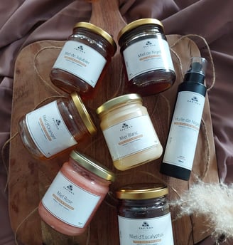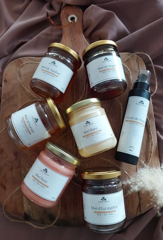 L'Huile de Nigelle-Le crémeux rose-Le crémeux blanc-Le caramélisé(eucalyptus)-Le mentholé(jujubier)-Le boisé caramélisé(miel de nigelle)-Le doux floral(oranger)